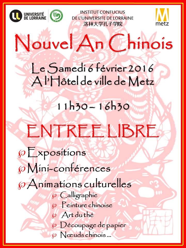 Un évènement de festivités sera organisé par l'Institut Confucius de l'Université de Lorraine le Samedi 6 février 2016 dans les Salons de l'hôtel de ville de Metz avec le soutien de la Mairie.