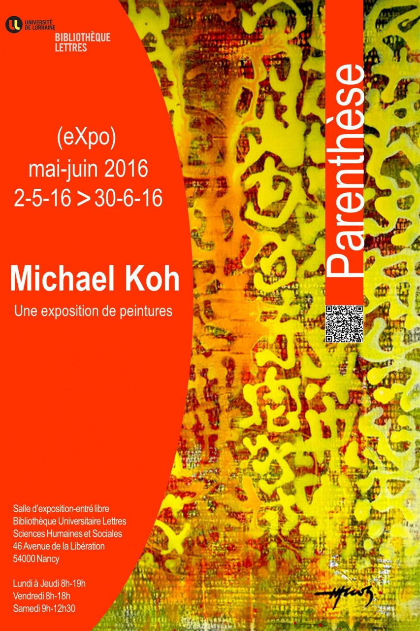 Michael Koh propose une exposition de peintures Parenthèse du 2 mai 2016 au 30 juin 2016 à la Bibliothèque universitaire de lettres. Dans la syntaxe sobre de Michael Koh, le jaune - couleur explosive s’il en est - ponctue la phrase comme un point d’exclamation, comme une parenthèse.