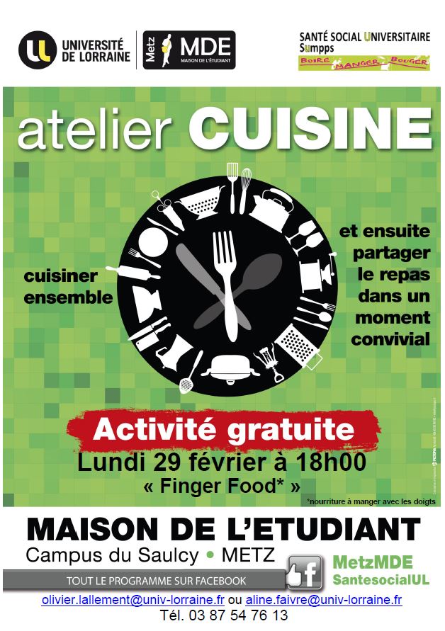 On vous a toujours dit que c'était malpoli de manger avec les doigts ? Aujourd'hui on casse les codes !Venez découvrir des recettes faciles, pratiques et conviviales à déguster en laissant les couverts au placard !Atelier de cuisine ouvert et gratuit pour tous les étudiants de l'Université de Lorraine.Pour vous inscrire : olivier.lallement@univ-lorraine.fr en laissant nom, prénom, composante et numéro de téléphone.En espérant vous voir nombreux !! Aline, diététicienne du Sumpps. Tous les événements du Sumpps sur Factuel et sur Facebook.