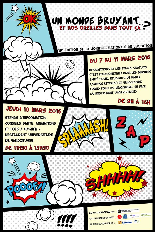 Cette campagne de sensibilisation et de prévention sur l’importance de « prendre soin de ses oreilles » se déroulera sous forme d’une animation autour de stands, où l’étudiant pourra s’entretenir avec des professionnels de santé. Des documents pédagogiques seront à disposition et un jeu permettra à tous les participants de gagner un lot utile (bouchons d’oreilles …). Un bon pour un dépistage auditif gratuit sera distribué à tous, avec 3 choix de lieu pour la réalisation du test audiométrique : soit dans les locaux du Sumpps du Vélodrome à Vandœuvre (de 9h à 16h, semaine du 7 au 11 mars, en face du Resto U de Vandœuvre), soit dans les locaux du SUMPPS des Lettres à Nancy (de 9h à 16h, semaine du 7 au 11 mars, campus Lettres), soit dans les locaux de l’Ecole d’Audioprothésistes (de 10h à 16h, jeudi 10 mars, Faculté de Pharmacie, salle de Travaux Pratiques de Physique et d’Audioprothèse, 4° étage du 3° hall, escalier D).