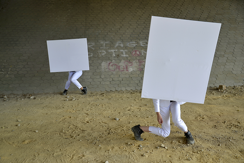 Perturbations poétiques augmentées reprend le principe de Perturbations poétiques* avec une démultiplication du nombre de « VRP ». Les « VRP », Voyageurs représentants poétiques sont des êtres qui cultivent un certain sens du décalage et de l’absurde. L’espace subit une « invasion » d’êtres poétiques munis de cadres blancs qui développent une architecture mobile au rythme « décalé ».