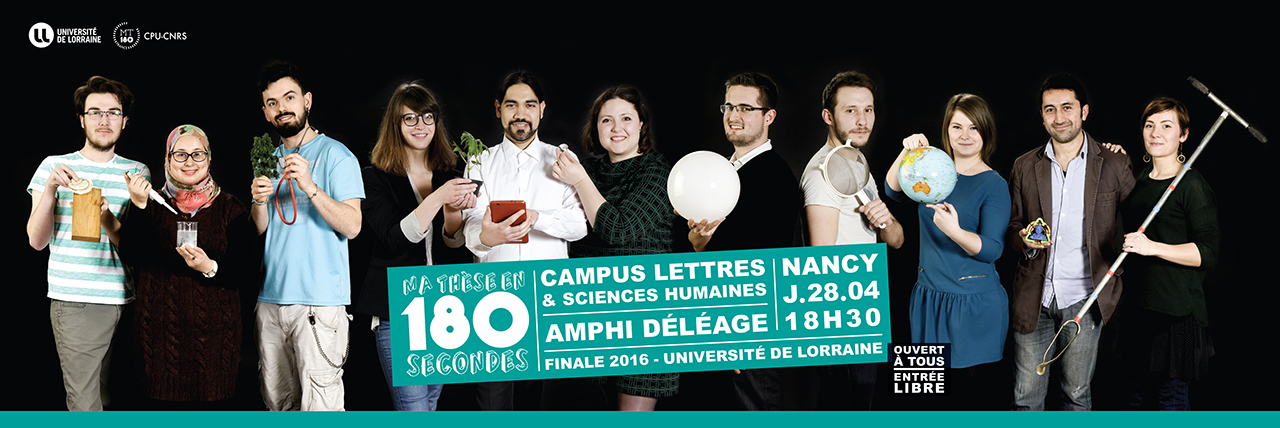Une trentaine de doctorants se sont inscrits au concours Ma thèse en 180 secondes. Lors d’une journée de présélections fin février, onze candidats ont été sélectionnés pour la finale de l’Université de Lorraine qui se déroulera le jeudi 28 avril 2016 à Nancy.