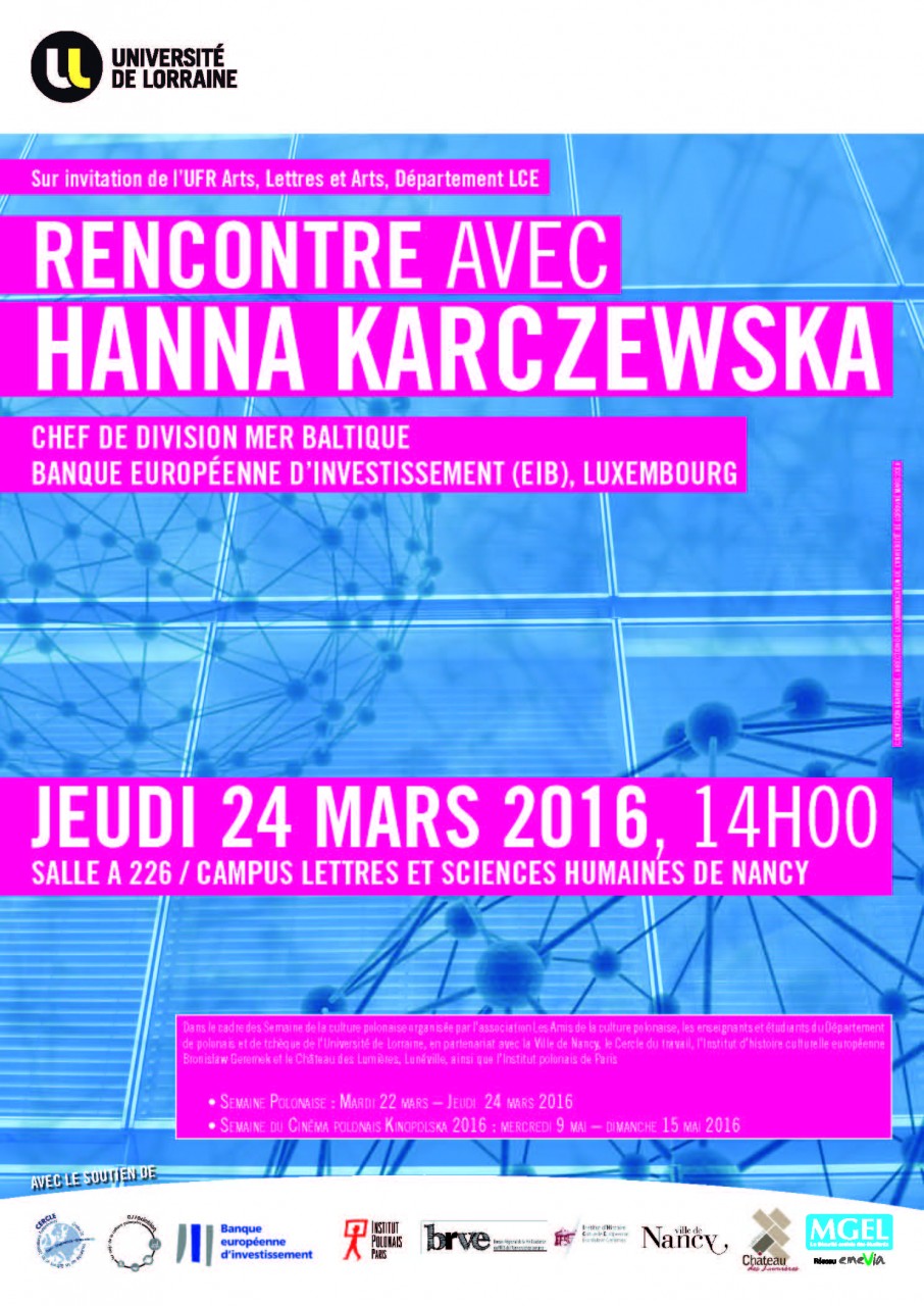 Dans le cadre de la semaine de la culture polonaise, Madame KARCZEWSKA, chef de division Mer Baltique à la Banque européenne d'investissements au Luxembourg, donnera une conférence le jeudi 24 mars à 14h00 sur le thème de la parité homme/femme, des initiatives collectives et du jeune entrepreneuriat européen en salle A 226 sur le campus Lettres et Sciences Humaines.