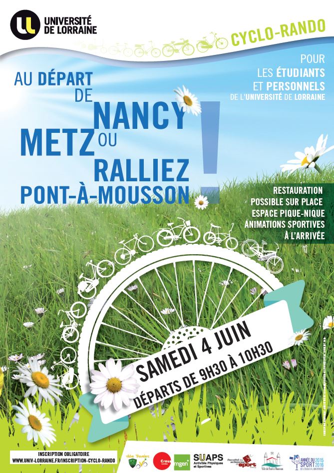 L'Université de Lorraine a le plaisir de convier les étudiants et les personnels de l'établissement à la première cyclo-rando le samedi 4 juin. Au départ de Metz (Ile du Saulcy) ou Nancy (Campus Lettres et Sciences Humaines), ralliez Pont-à-Mousson à vélo!Sur place, des animations sportives et ludiques vous seront proposées par le SUAPS. Restauration possible sur place / Espace pique-nique Départs de 9h30 à 10h30 Charte du participant Si vous souhaitez y participer, merci de vous inscrire via ce formulaire