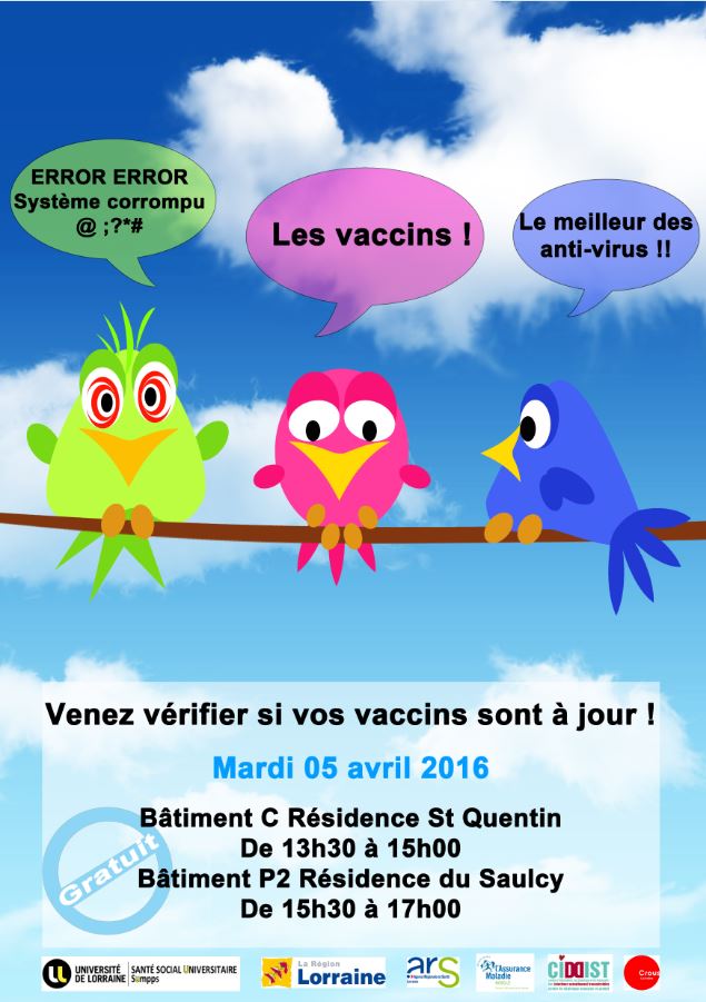 Afin de relayer cette 10ème SEV, le SUMPPS* met en place une campagne de sensibilisation sur la vaccination : le mardi 5 avril 2016 au bâtiment C de la cité universitaire du Saint-Quentin de 13h30 à 15h puis au P2 de la cité universitaire du Saulcy à Metz de 15h30 à 17h ; le mardi 26 avril 2016 de 11h30 à 13h30 à la cafétéria CROUS et au SUMPPS, Campus des Lettres et Sciences Humaines, 23 bld Albert 1er à Nancy.