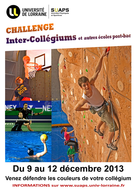Dans le cadre des "animations" Vie Universitaire de fin d'année, le SUAPS propose, aux étudiants et personnels de l’Université de Lorraine, de participer au Challenge Inter-Collégium 2013.