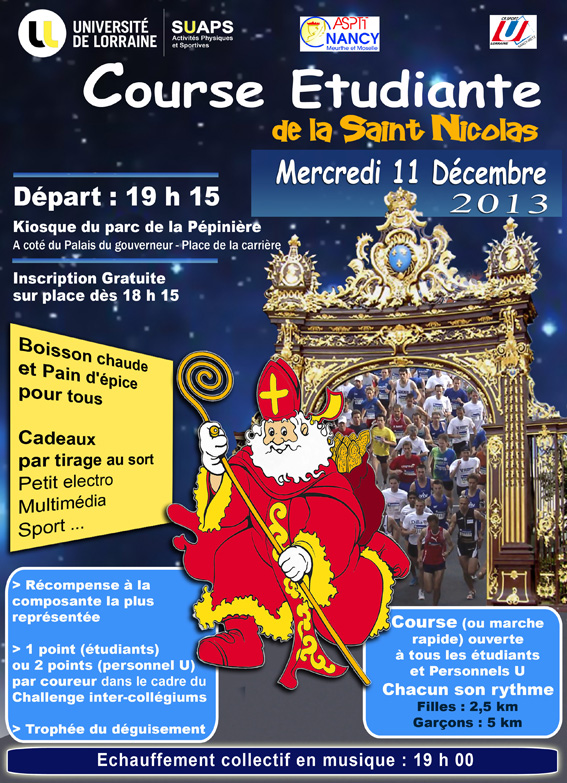 Manifestation au cœur de la ville, à la fois sportive, conviviale et fédératrice, la course de la Saint Nicolas est une tradition de la vie étudiante lorraine. Elle est ouverte à tous les étudiants et personnels de l’Université de Lorraine.