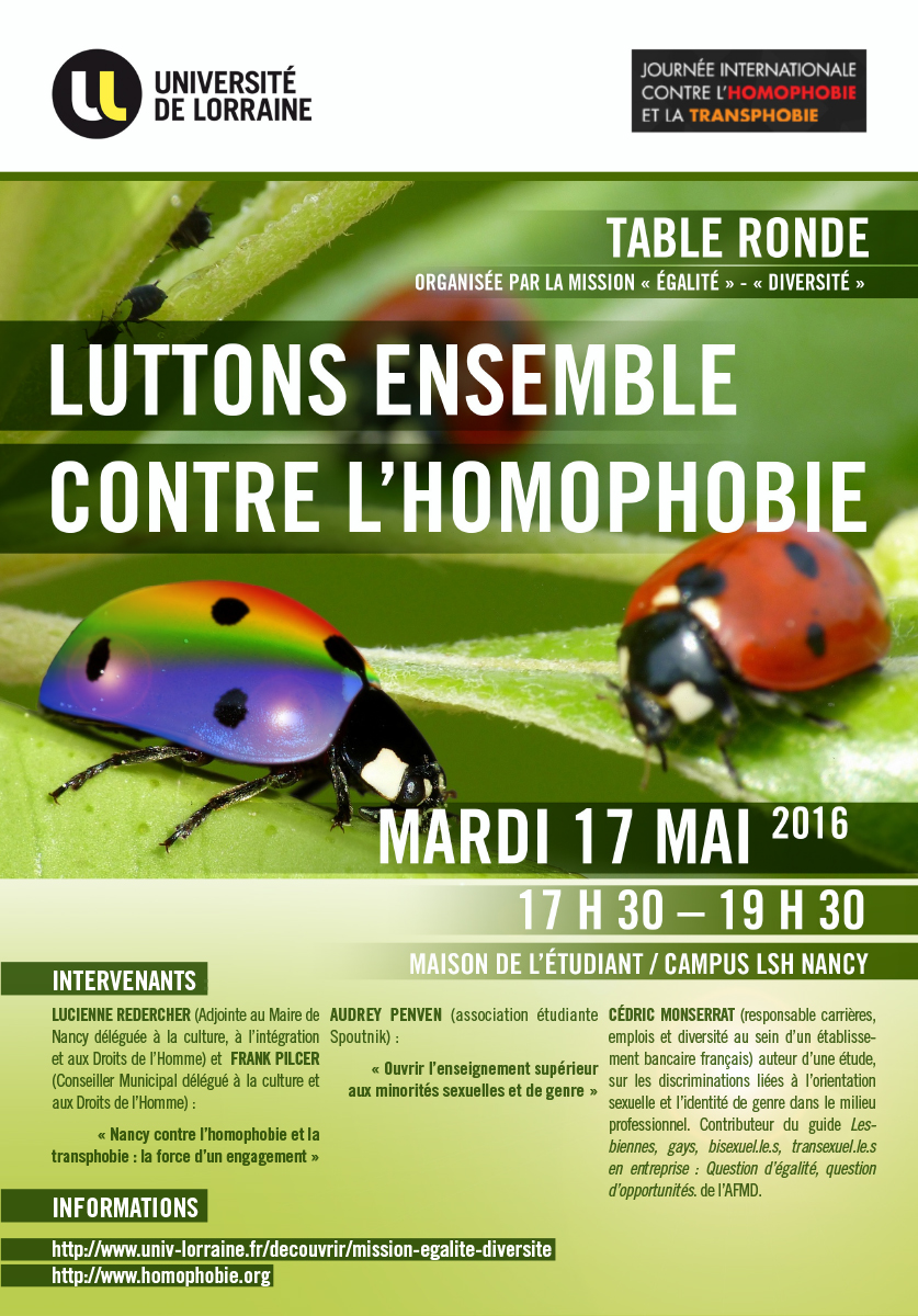 Cette table ronde, organisée par la mission Egalité - Diversité dans le cadre de la Journée internationale contre l'homophobie et la transphobie, rassemnle :
