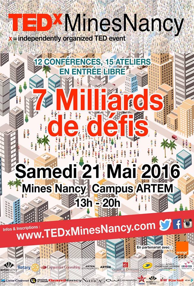 La troisième édition de l’unique cycle de conférences TEDx de Lorraine, TEDxMinesNancy : «7 Milliards de Défis » aura lieu le 21 mai 2016 sur le campus Artem, à Nancy.