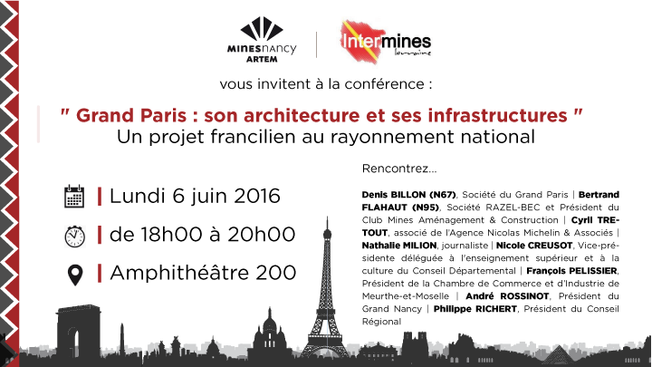 Mines Nancy et Intermines Lorraine vous invitent le lundi 6 juin 2016 à la conférence : "Grand Paris : son architecture et ses infrastructures", de 18h00 à 20h30, en amphithéâtre 200 à Mines Nancy.