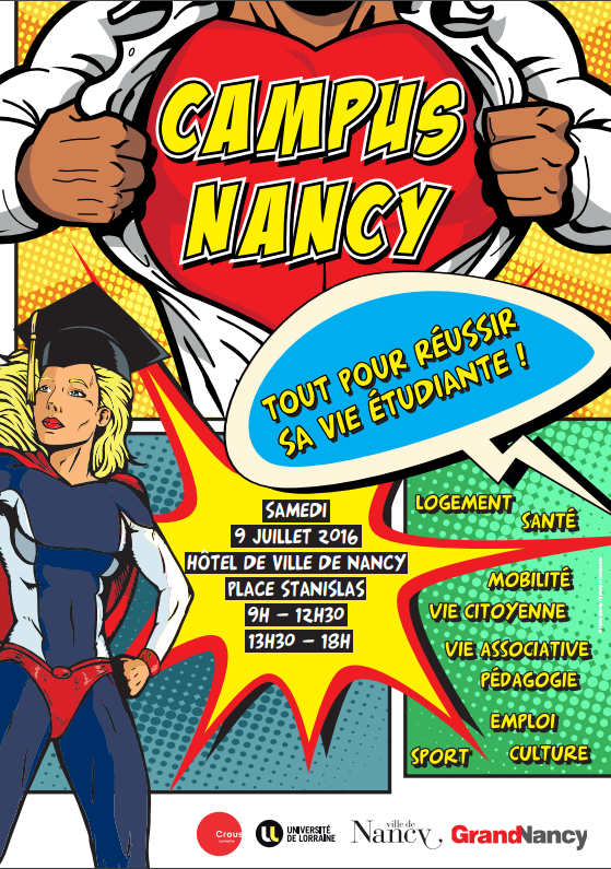 La Communauté urbaine du Grand Nancy, l’Université de Lorraine et le CROUS Lorraine, en partenariat avec de nombreux autres acteurs, invitent les néo-bacheliers et leurs parents, ainsi que tout étudiant à la recherche d’informations, à la première édition de la journée d’accueil et d’information "Campus Nancy – Tout pour réussir sa vie étudiante !" qui se déroulera le samedi 9 juillet 2016 de 9h00 à 18h00 dans les Salons de l’Hôtel de Ville de Nancy, entrée Place Stanislas (entrée libre).