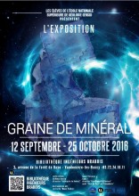 GRAINE DE MINÉRAL est l'aboutissement d'un projet d'étude de plusieurs étudiants de l'ENSG de Nancy. Cette exposition est visible du 12/09 au 25/10/2016 à la bibliothèque universitaire Ingénieur-Brabois qui vous accueille tous les jours de 8h à 19h. Cette exposition a pour objectif de vulgariser la minéralogie au travers de 15 panneaux explicatifs.