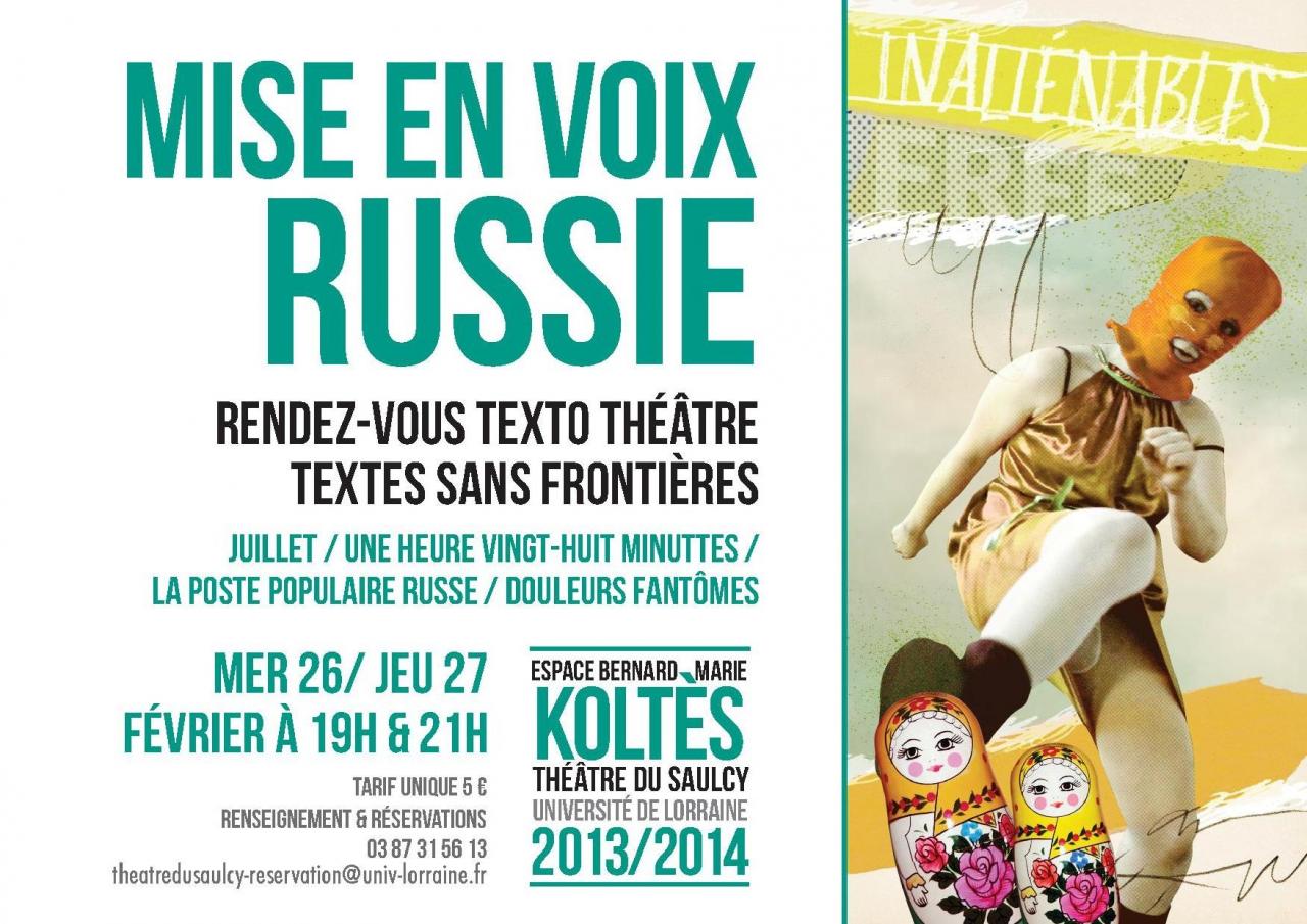 Cette cinquième édition des mises en voix de textes dramatiques sans frontière s’est penchée sur la Russie et ses auteurs dramatiques contemporains, non pas pour un effet d’exotisme, non pas par souhait de tourisme culturel, non pas pour un effet d’étrangeté... non, tout simplement parce que la Russie c’est l’autre, et l’autre : c’est nous. Nous et chacun d’entre nous ; avec toutes nos différences d’appréciations, nos divergences sociétales, nos nuances comportementales ; bref, nos diverses sensibilités éducatives et émotionnelles, environnementales et culturelles. Depuis la fin du régime communiste, la Russie est un pays qui nous interpelle beaucoup. Acteur économique et politique important dans le concert des nations, son rapport à l’art et à la liberté démocratique nous interroge toujours. Depuis toujours, la littérature et la dramaturgie russe ont été des miroirs dénonçant les réalités du / de leur monde.