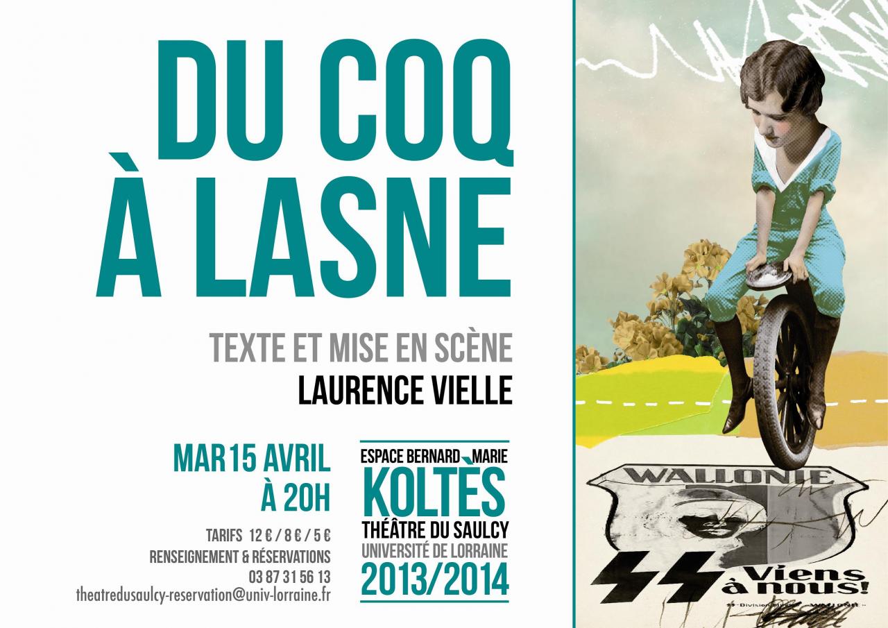 Laurence Vielle, conteuse, expérimente cette traversée. Elle a voyagé au cœur de la Belgique, au cœur de ses récits, des récits qu'on préférerait oublier. Du coq à Lasne, c'est l'histoire d'Alice qui voit ses deux fils se faire déporter pour Résistance et son frère devenir un collaborateur. Un récit de tabous, de non-dits. Une famille dans laquelle le silence règne en maître. Grâce à des travaux documentaires pointilleux, Laurence Vielle nous brosse le portrait d'une Belgique de la seconde guerre, d'une famille déchirée comme il y en a eu tant.