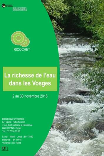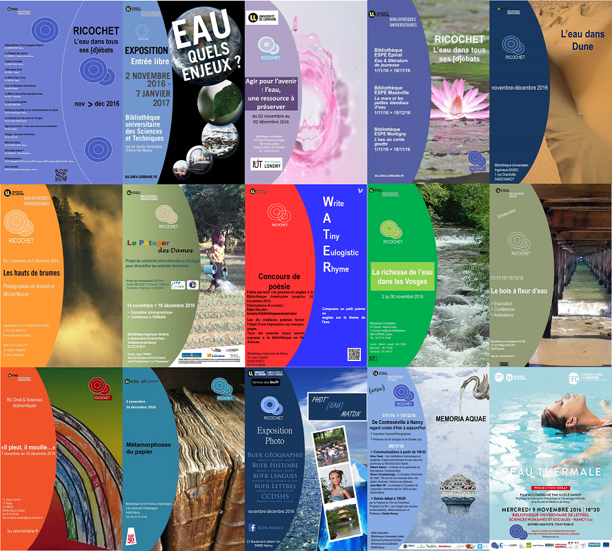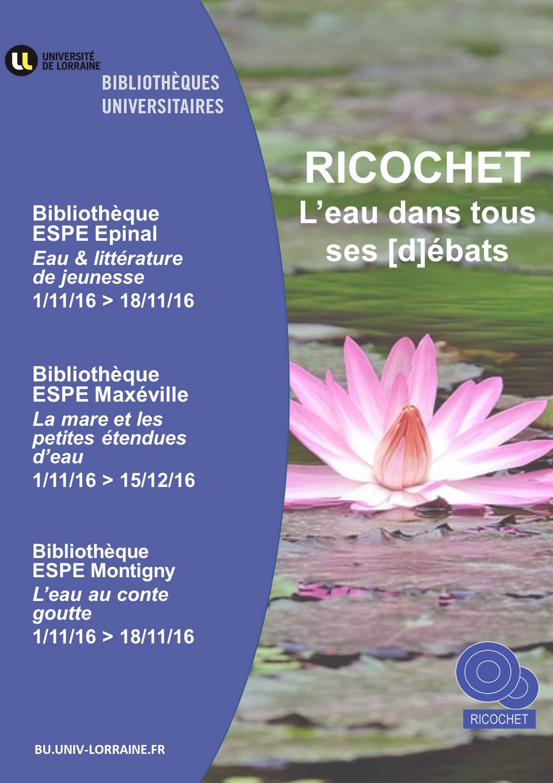 Bibliothèques universitaires lorraines, partenaires institutionnels du Grand Est, enseignants-chercheurs de l'Université de Lorraine, instances de l'Université de Lorraine et artistes lorrains ont permis l'aboutissement du projet RICOCHET. Les différents protagonistes ont travaillé ensemble autour de l'eau en investissant les aspects pédagogiques, les recherches récentes en sciences, les démarches innovantes en bioéthique, les investigations en santé et les liens sociaux au travers des temps par les arts et l'archéologie. Expositions, débats, projections, conférences favorisent la rencontre de différents acteurs pour débattre autour de la thématique de l’eau. La présence des artistes révèle un continuum entre les différentes façons d'étudier, de découvrir, d'entendre l'eau sous toutes ses formes. RICOCHET symbolise l'eau comme vecteur de messages, au propre comme au figuré - L'eau, ambivalente entre sérieux scientifique et source d'imaginaire, reflète des liens sociaux forts.