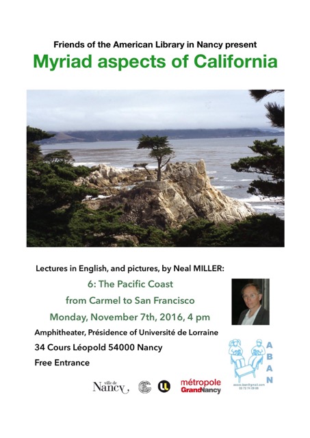 La Bibliothèque Américaine de Nancy, avec les Amis de la Bibliothèque Américaine (Association ABAN) présente, le lundi 7 novembre 2016 à 16h, la sixième conférence illustrée de Neal Miller sur "La Californie: The Pacific Coast: from Carmel to San Francisco". Conférence en anglais. Entrée libre.
