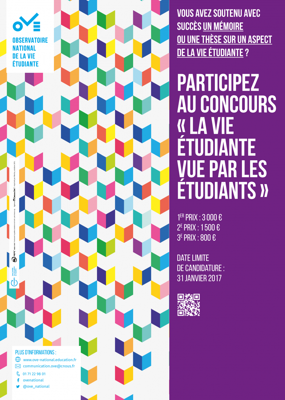 Pour la 26e année consécutive, l’OVE lance son concours national « La vie étudiante vue par les étudiants ». Ce concours est destiné à encourager les recherches sur les conditions de vie des étudiants menées par les étudiants eux-mêmes. Il est ouvert aux étudiants de master (M1 et M2) et de doctorat de toutes disciplines, ayant soutenu avec succès un mémoire ou une thèse dont l’objet porte sur un des aspects de la vie étudiante.