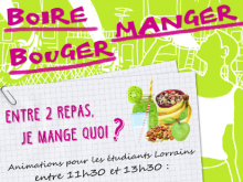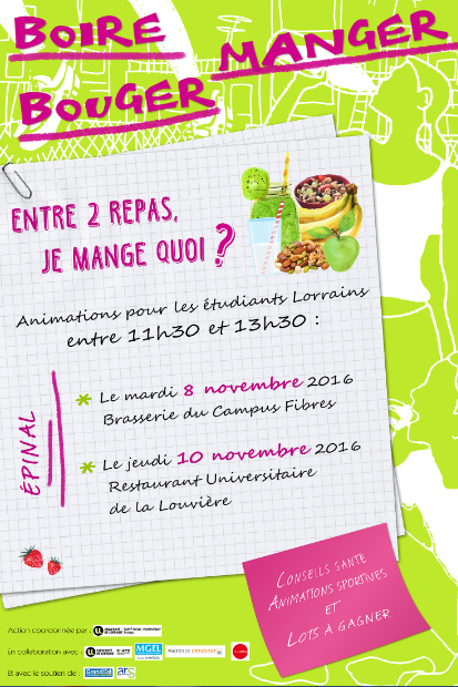 Le SUMPPS (Service Universitaire de Médecine Préventive et de Promotion de la Santé) de l’Université Lorraine met en place une campagne d’information et de prévention autour du thème BOIRE MANGER BOUGER du 27 septembre au 6 décembre 2016, en collaboration avec le CROUS de Lorraine, le Service des Sports Universitaire (SUAPS), la MGEL, la Maison de l’Etudiant d’Epinal, et avec le soutien de l’ARS et de la Région Grand Est.