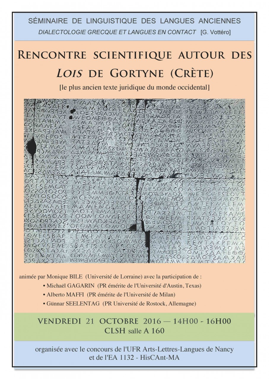 Dans le cadre du séminaire de linguistique des langues anciennes (G. Vottéro) est organisée une rencontre internationale autour des Lois de Gortyne (ou Code de Gortyne) animée par Monique Bile (UL, spécialiste reconnue du dialecte crétois), avec la participation de M. Gagarin (PR Université d'Austin, Texas, spécialiste de droit et de littérature grecs antiques), A. Maffi (PR Université de Milan, juriste spécialiste du droit antique), et G. Seelentag (PR Université de Rostock, historien de l'Antiquité). Ces Lois, qui constituent le plus ancien texte juridique du monde occidental (et un des plus anciens connus au monde), sont rédigées dans un dialecte complexe, au style très elliptique, et nécessitent une approche pluridisciplinaire large. Elles ont fait dernièrement l'objet de plusieurs publications. C'est donc ici l'occasion de confronter les points de vue de linguistes, juristes, historiens, archéologues et sociologues.