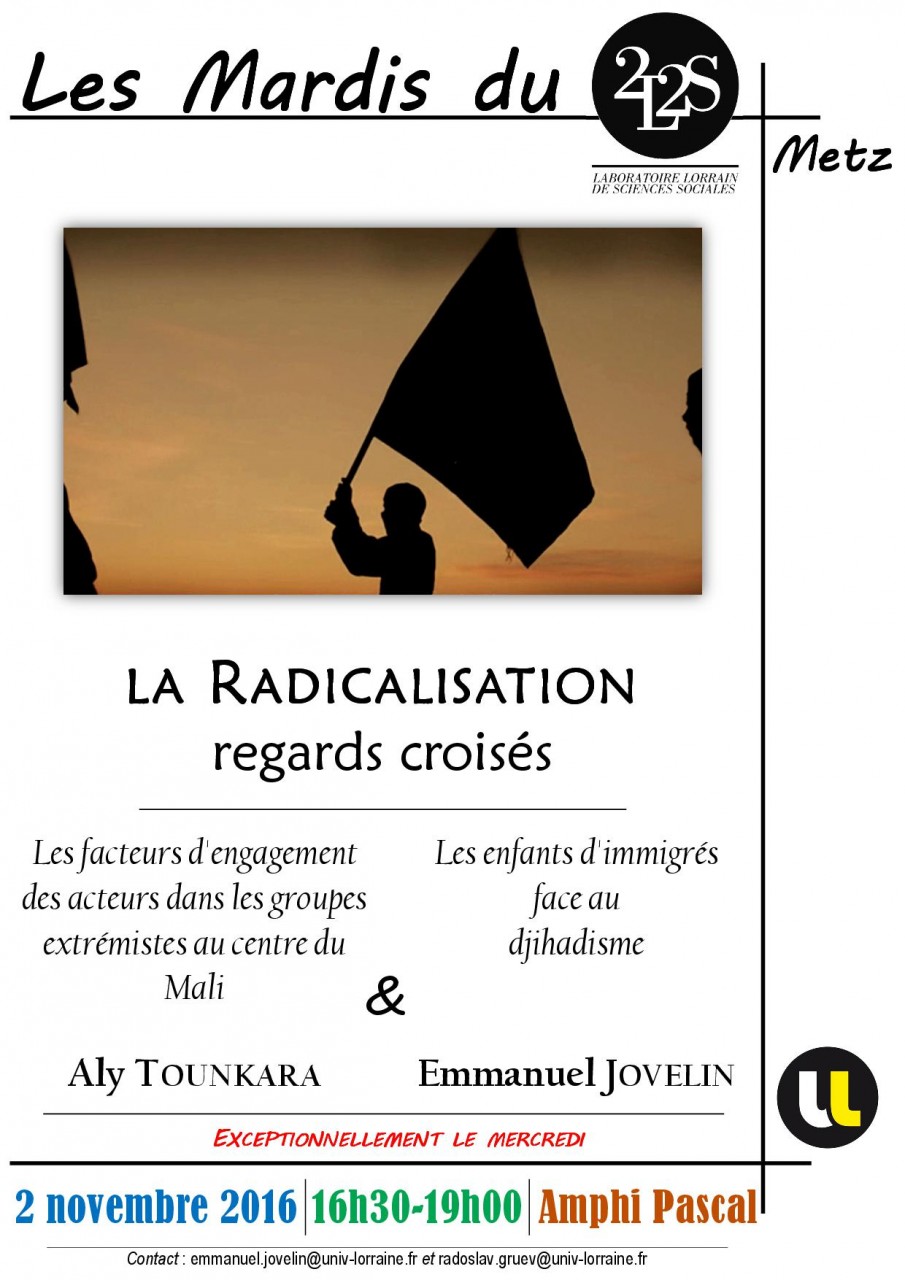 Emmanuel Jovelin et Radoslav Gruev vous proposent un séminaire consacré à la radicalisation autour de deux interventions : Aly Tounkara (MCf en sociologie à l'Université de Bamako), Les facteurs d'engagement des acteurs dans les groupes extrémistes au centre du Mali ; et Emmanuel Jovelin (professeur de sociologie à l'Université de Lorraine), Les enfants d'immigrés face au djihadisme.