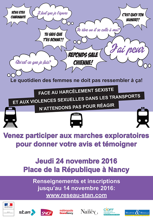Dans le cadre du plan national de lutte contre le harcèlement sexiste et les violences sexuelles, la Préfecture de Meurthe-et-Moselle organise, en partenariat avec le réseau Stan, le réseau Ted' et la SNCF, plusieurs marches participatives.