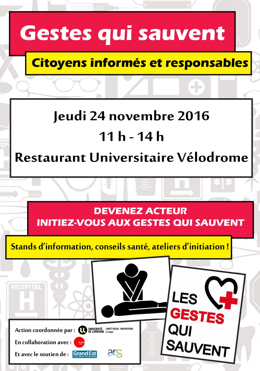 Le Service universitaire de médecine préventive et de promotion de la santé (SUMPPS) de l'Université de Lorraine propose aux étudiants une information et des ateliers d’initiation sur les gestes qui sauvent le jeudi 24 novembre de 11h à 14h au Restaurant universitaire Vélodrome à Vandoeuvre-lès-Nancy. Des professionnels de santé formateurs en secourisme animeront cette action en répondant aux questions et en invitant les étudiants à se rendre sur les ateliers. L'objectif de cette mobilisation est de sensibiliser aux gestes de premiers secours et d’inciter les étudiants à se former et à devenir des citoyens informés et responsables.