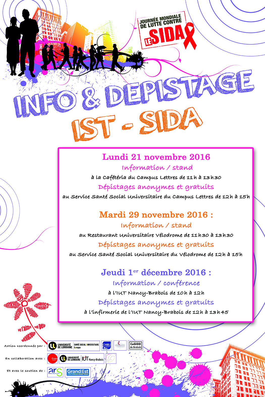 -jeudi 1er décembre, informations et conférence de 10h à 12h à l’IUT Nancy-Brabois et de 12h à 13h45 à l’infirmerie pour des dépistages anonymes et gratuits (IUT Nancy-Brabois) ;