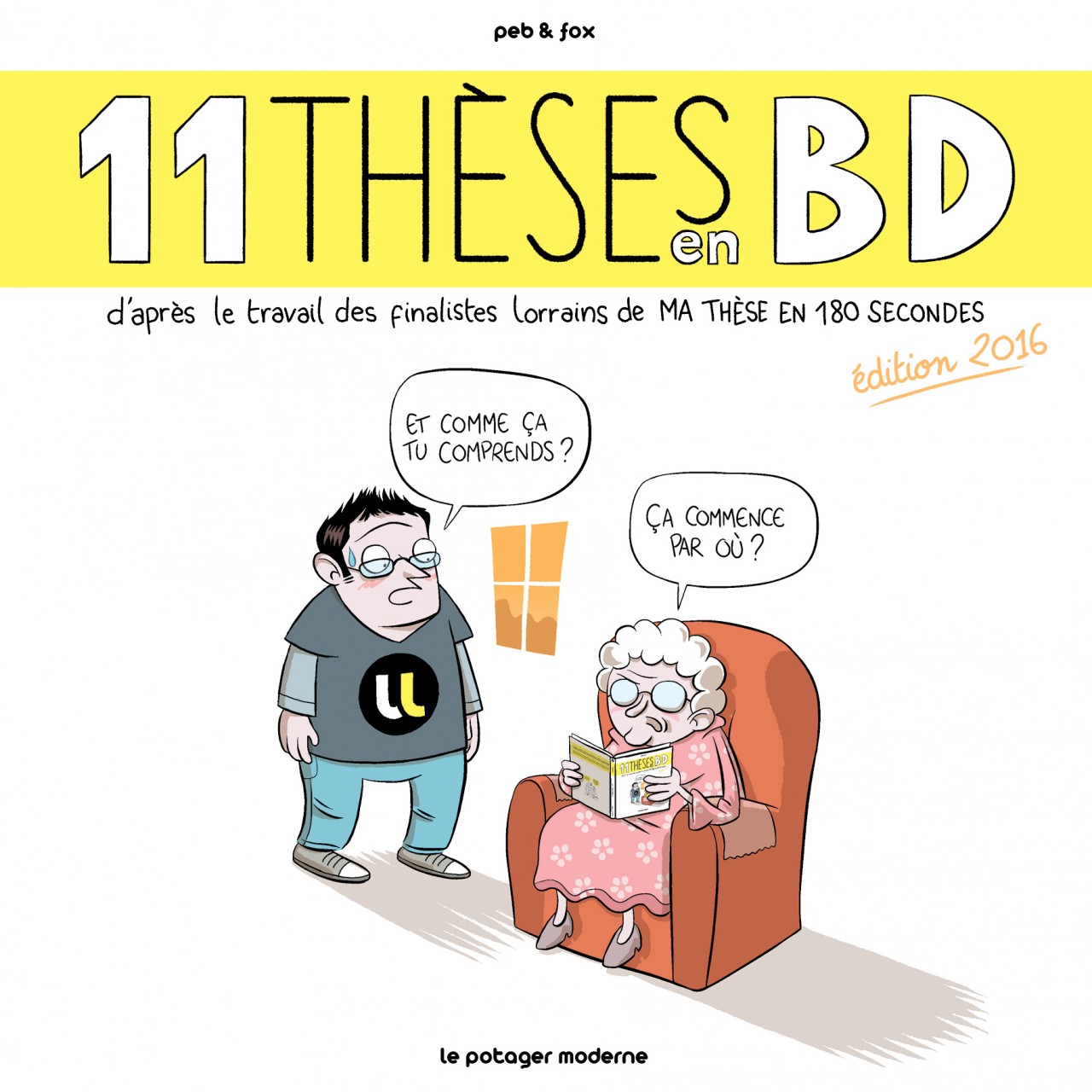 À l’occasion de la finale de l’Université de Lorraine au concours Ma thèse en 180 secondes 2016, l’université s’est tourné vers le duo de dessinateurs Peb & Fox pour adapter en bande-dessinée les projets de recherches des 11 doctorants finalistes.
