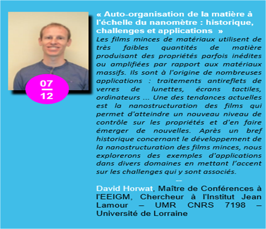 David Horwat vous parlera de l' "Auto-organisation de la matière à l'échelle du nanomètre : historique, challenges et applications".