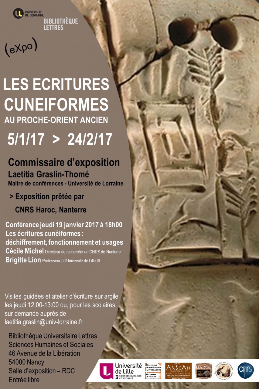 Cécile Michel Directeur de recherche au CNRS de Nanterre et Brigitte Lion Professeur à l'Université de Lille III animeront une conférence Les écritures cunéiformes : déchiffrement, fonctionnement et usages dans le cadre de l'exposition jeudi 19 janvier 2017 à 18h00.