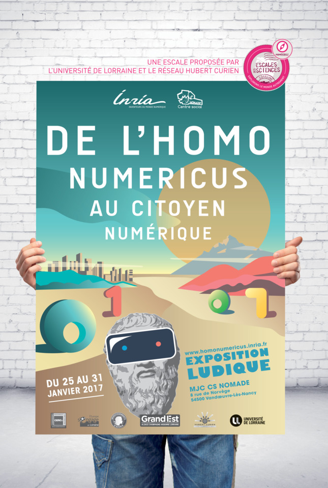 Maîtriser le numérique pour ne pas le subir, c’est ce que propose l’exposition itinérante « De l’homo numericus au citoyen numérique », réalisée par le centre Inria Nancy – Grand Est et la MJC centre social Nomade.Au travers d’animations ludiques (danse avec le robot Poppy, jeux de logique, écran interactif, application collaborative, visite virtuelle avec casque immersif…), elle aide le visiteur à se familiariser avec les concepts sur lesquels repose l’informatique et le sensibilise aux enjeux du numérique, pour l’aider à devenir un citoyen éclairé sur ces questions. L’exposition prendra ses premiers quartiers à la MJC centre social Nomade à Vandoeuvre-Lès-Nancy, du 25 janvier (jour de l’inauguration) jusqu’au 31 janvier 2017. Des spectacles (représentations théâtrales, clownerie, animations) ponctueront les visites du mercredi 25 et du samedi 28 janvier. Elle sera ensuite disponible pour être accueillie dans d’autres structures lorraines (établissements scolaires, MJC, salles des fêtes, médiathèques…).