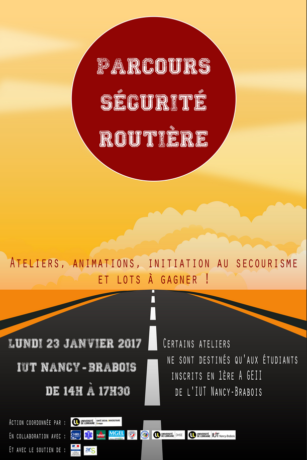 Le SUMPPS* de l’Université de Lorraine (UL) organise un "Parcours Sécurité Routière " le lundi 23 janvier 2017 dès 14h à l’IUT Nancy-Brabois. Cette action débutera par la projection (ouverte à tous) d’un film sur la prévention routière, qui sera suivie d’un temps d’échange en présence d’un médecin addictologue (amphi 2, RDC bât. administratif). Puis, quatre ateliers (d’une durée de 40 min. et destinés aux étudiants 1ère A GEII) se succéderont, selon un parcours déterminé de l’atelier A à l’atelier D de 14h30 à 17h30 :