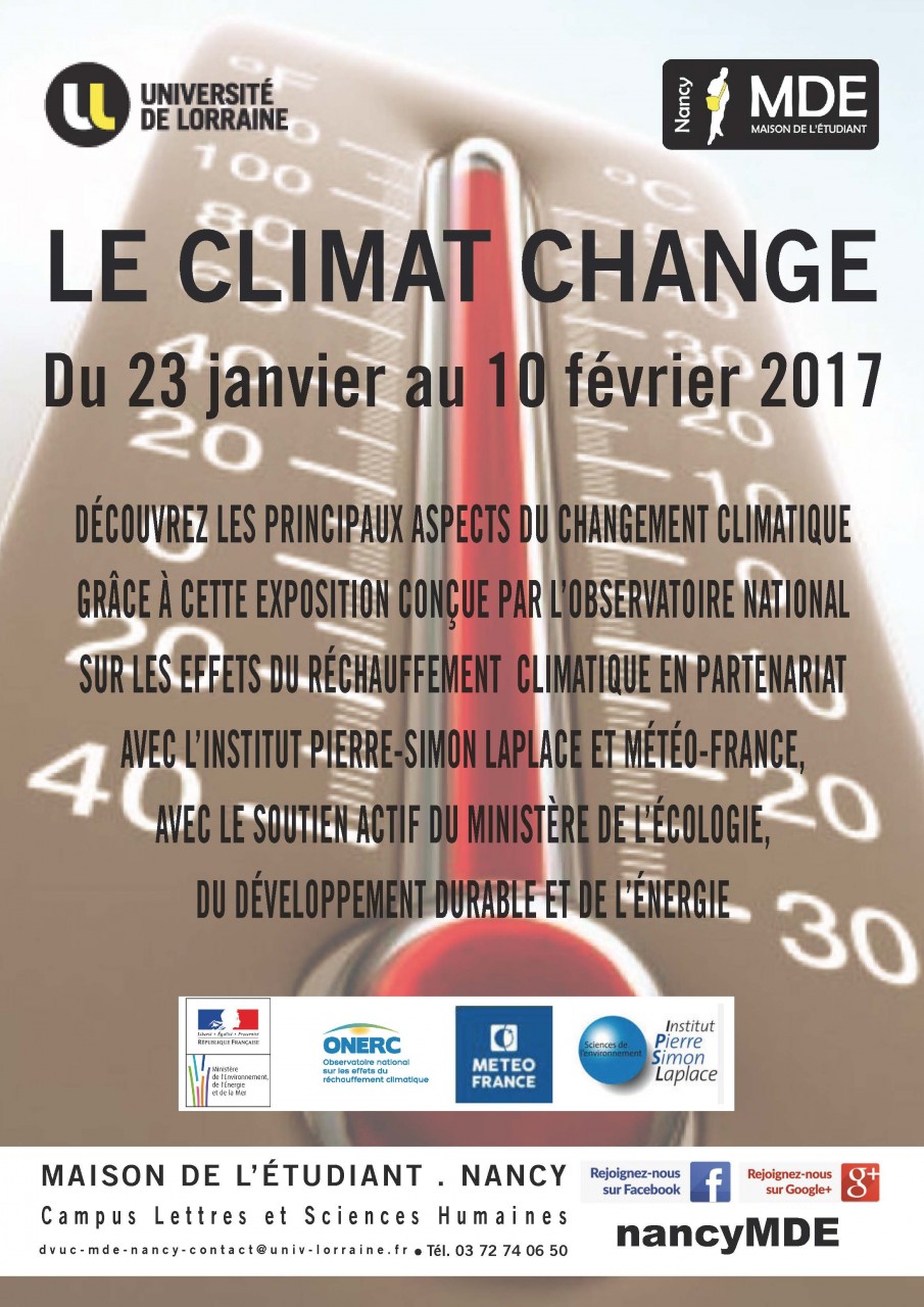 Du 23 janvier au 10 février 2017 venez observer l'exposition “Le climat change” conçue par l’Observatoire National sur les Effets du Réchauffement Climatique (ONERC) en partenariat avec l’Institut Pierre-Simon Laplace et Météo-France, avec le soutien actif du Ministère de l’Écologie, du Développement durable et de l’Énergie. Découvrez les principaux aspects du changement climatique à travers huit panneaux qui vous feront comprendre les avancées scientifiques, synthétisées dans le 5ème rapport d’évaluation du GIEC et dans les rapports des équipes françaises de recherche sur le climat .