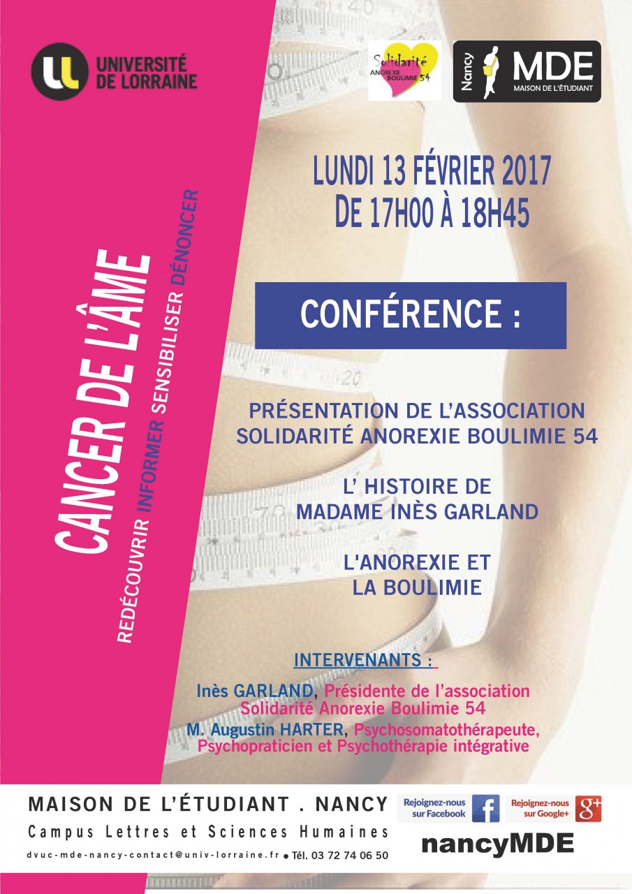 Après avoir frôlé la mort, la jeune nancéienne, toujours suivie médicalement, crée l’association Solidarité Anorexie Boulimie 54, avec le soutien de Bruno De Beaurepaire, président du réseau associatif national du même nom. Elle vient de terminer l’écriture d’un livre sur son douloureux itinéraire. Inès nous donne rendez-vous lors de cette conférence pour comprendre son parcours , celle-ci sera suivie d’autres conférences cette année en compagnie d’autres spécialistes qui l’ont suivie et la suivent encore. Les thèmes seront toujours en rapport avec l’alimentation. Conférence Lundi 13 Février de 17h00 à 18h45 à la Maison De l’Étudiant.Intervenants : - Inès GARLAND, présidente de l’association Solidarité Anorexie Boulimie 54