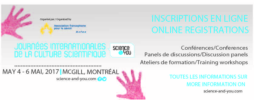 Consultez le programme préliminaireLes inscriptions sont désormais ouvertes. Faites vite, le nombre de places est limité ! Vous souhaitez vous inscrire ? Profitez du tarif préférentiel jusqu’au 8 avril 2017 pour vous inscrire en ligne. Si vous souhaitez également participer au congrès annuel de l’Acfas, qui aura lieu du 8 au 12 mai 2017, un tarif réduit vous est offert pour participer aux deux événements. Inscriptions en ligne uniquementRetrouvez toutes les infos pratiques sur le site www.science-and-you.com