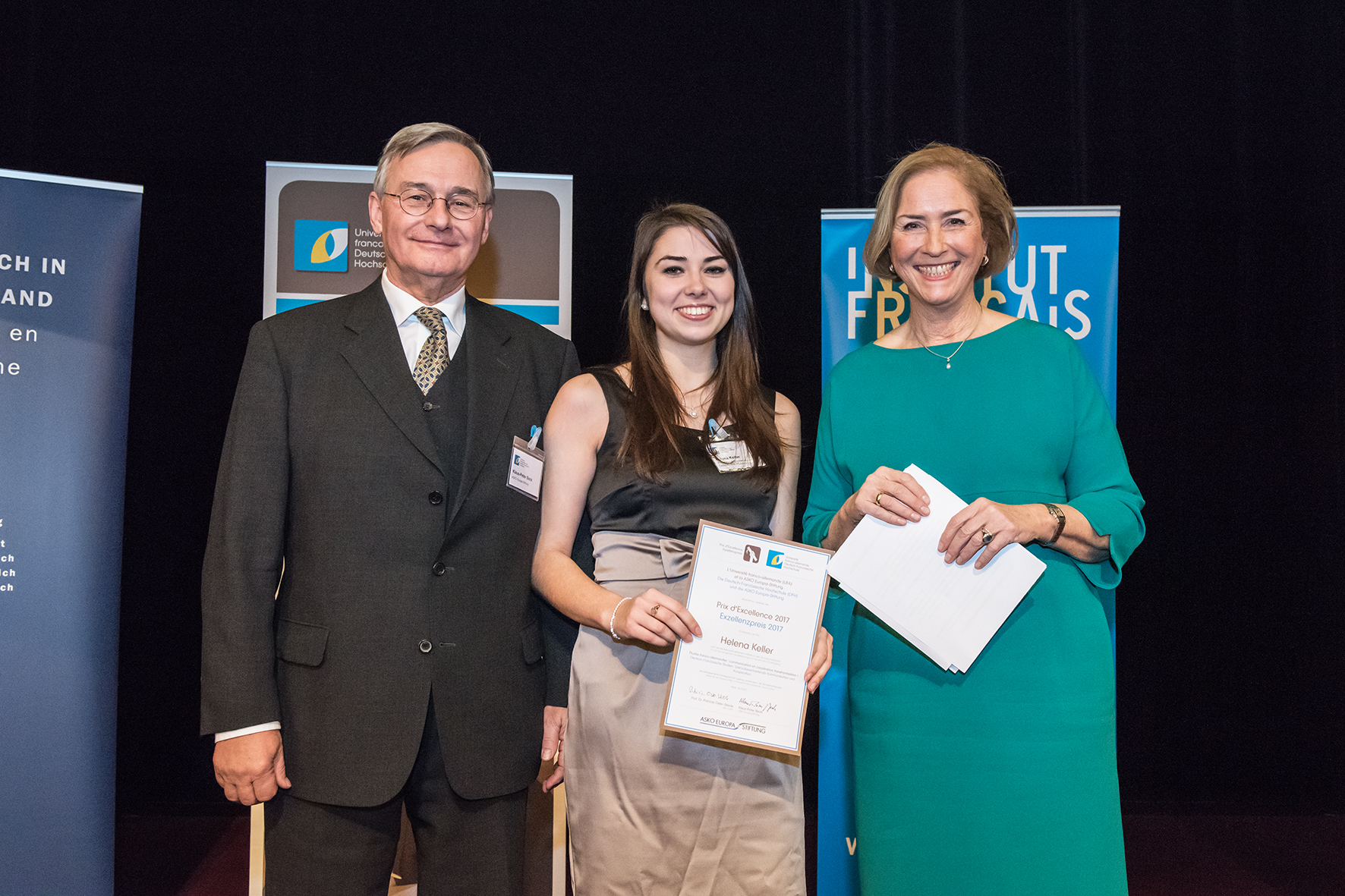 Le Prix d’Excellence a été décerné à Helena Keller, diplômée de l'Université de Lorraine, pour ses résultats particulièrement brillants au sein du cursus binational « Études franco-allemandes : Communication et Coopération transfrontalières ». Le prix est doté de 1 500 euros, financé avec l’aimable soutien de la ASKO Europa Stiftung.