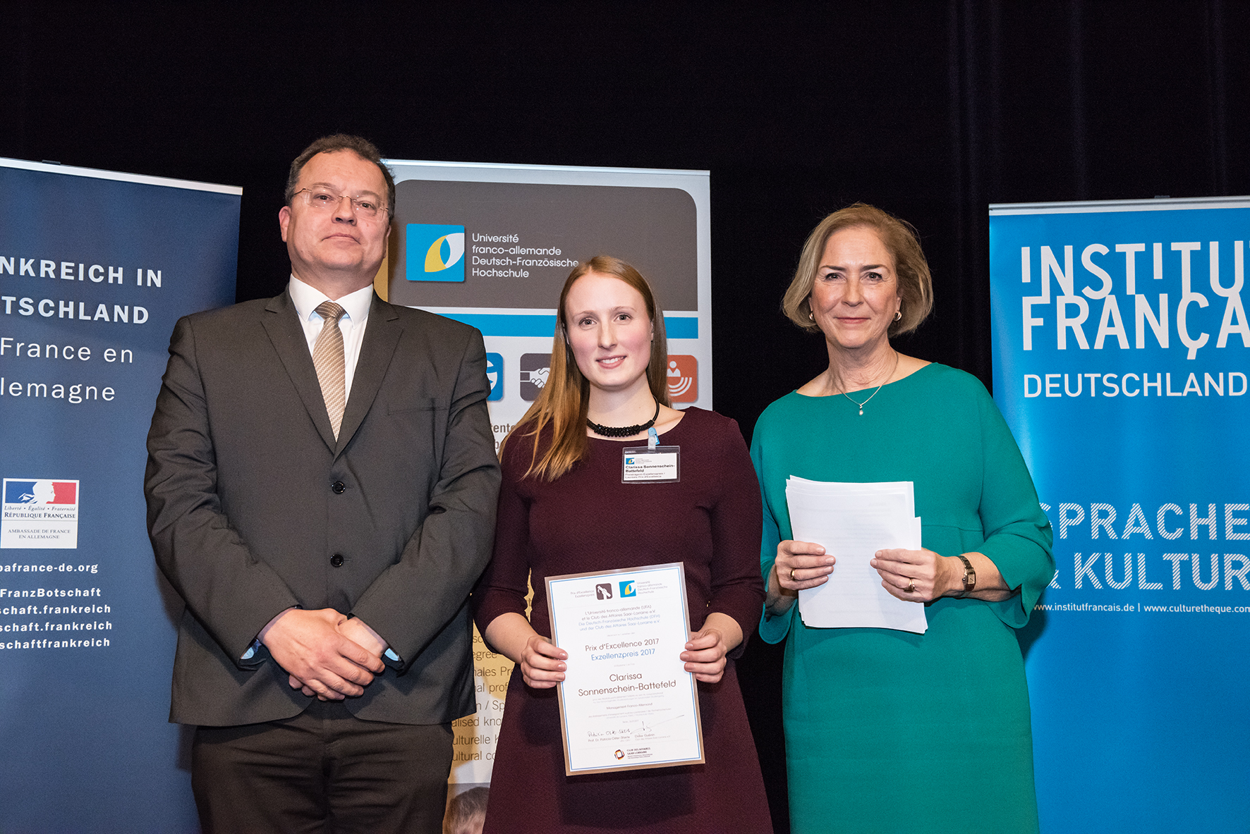 Un Prix d’Excellence a également été décerné à Clarissa Sonnenschein-Battefeld, qui a effectué le cursus binational « Management Franco-Allemand » de l'Université de Lorraine. Le prix doté de 1 500 euros est financé avec l’aimable soutien du Club des Affaires Saar-Lorraine.