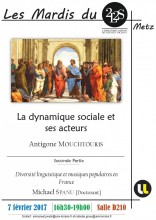 La prochaine séance des "Mardis du 2L2S-Metz" aura lieu le 7 février 2017, en salle D210, à partir de 16h30. Nous recevons Antigone Mouchtouris (Professeure en sociologie à l'UL) autour de la thématique de "La dynamique sociale et ses acteurs" et Michael Spanu (doctorant en sociologie à l'UL) autour de la question de la "Diversité linguistique et musiques populaires en France".