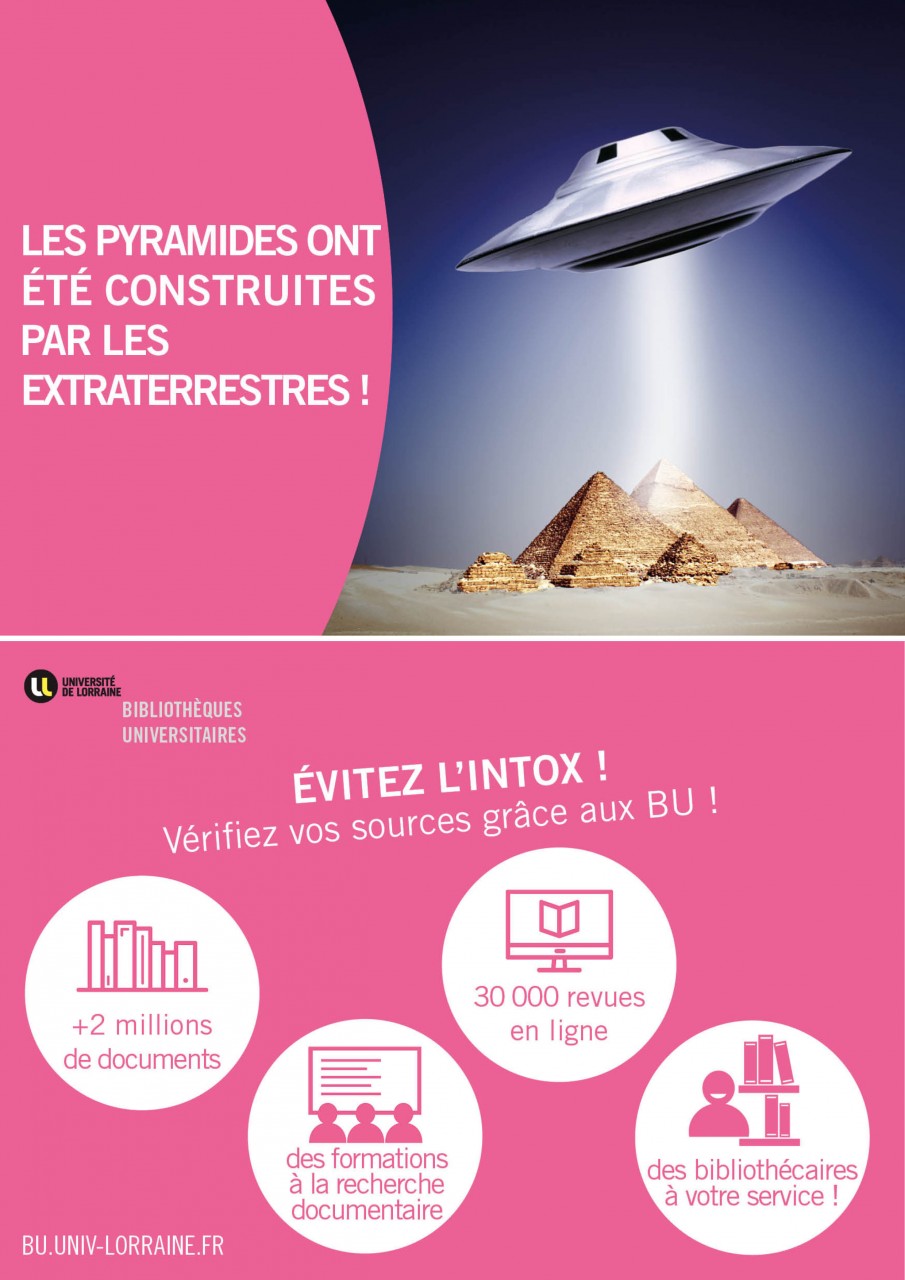 Il s’agissait de faire prendre conscience aux usagers, de manière décalée, que la vérification des sources et la maîtrise des techniques de recherche informationnelle et documentaire avaient toute leur place dans leur cursus universitaire. La conception et la réalisation de l’opération ont été totalement prises en charge en interne.
