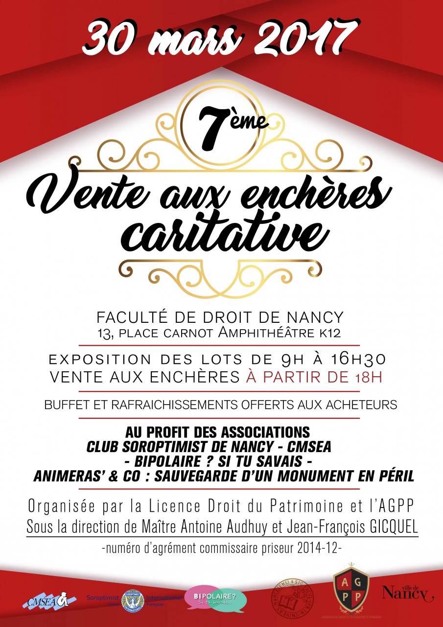 Cette année, nous vous donnons rendez-vous le 30 mars de 9h à 16h30 dans le cloître de la Faculté de Droit pour l'exposition des lots, et à partir de 18h pour la vente qui aura lieu dans l'amphithéâtre K12 de la Faculté de Droit !
