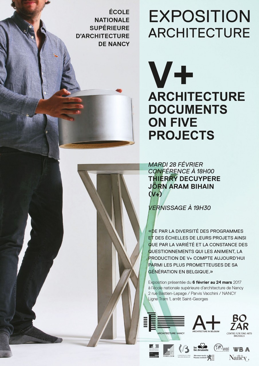 Cette exposition monographique est consacrée au travail d’un bureau d’architecture belge V+ qui compte aujourd’hui parmi les plus prometteuses de sa génération en Belgique et dont la pratique affirmée peut à la fois faire l’objet d’une lecture rétrospective et prospective. “Bureau vers plus de bien-être, plus de questions, plus d’intensité, plus d’aspiration, plus de conviction, plus de souffle...” Leur pratique se veut volontariste, optimiste et engagée. La production de V+ va de l’échelle de l’intervention urbaine et de l’aménagement d’intérieurs à celle de l’infrastructure publiques. Le bureau est régulièrement sollicité pour participer à des réflexions dans les champs pédagogique et culturel.