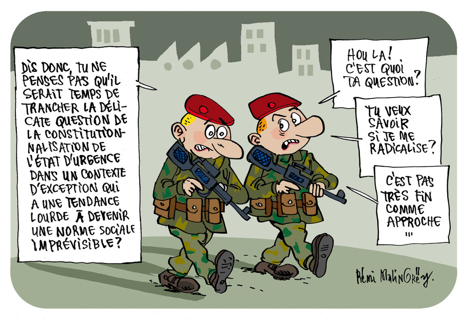 Il est donc bien vrai que l’état d’urgence est en passe de devenir une norme sociale en dépit de son imprévisibilité même. Autrement dit, la situation d’exception tend à se faire permanente et induit un nouveau type de légalité, en tout état de cause problématique eu égard aux standards de l’Etat de droit. Dans ces conditions, la constitutionnalisation de l’état d’urgence, qui pouvait se justifier par la mise en cause des libertés fondamentales qu’elle comporte, a cessé d’être exemplaire et a perdu de son intérêt. L’on assiste ainsi à la mise en place d’un état de droit de nécessité édifié par le gouvernement comme une réponse à un type nouveau de menace et de danger, et ce avec le consentement du législateur.