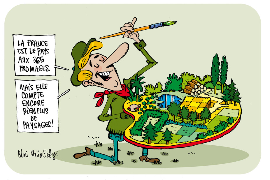 Publié à l’occasion du Salon de l’agriculture 2016, cet article est désormais porté par une touche poétique, celle du dessinateur Rémi Malingrëy, avec la référence gaullienne aux 365 fromages évoquant la foultitude de paysages agraires qui composent notre patrimoine, partagé et à transmettre. Rejoignons la palette optimiste de l’artiste, mais sans baisser la garde face à la banalisation des paysages et à l’érosion de la biodiversité.
