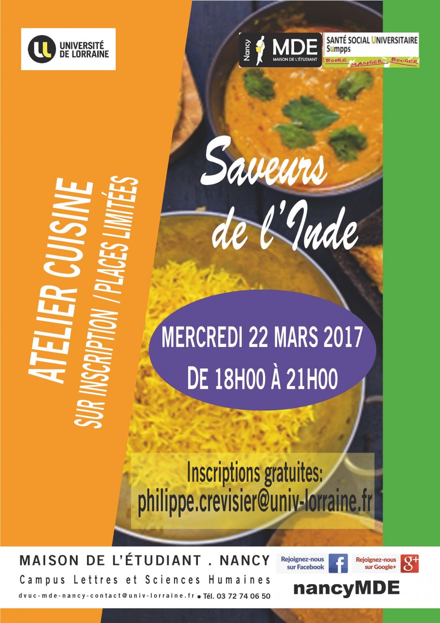 La Maison de l'Étudiant et le SUMPPS vous proposent leur prochain atelier cuisine, il nous fera voyager vers les saveurs de l'Inde.