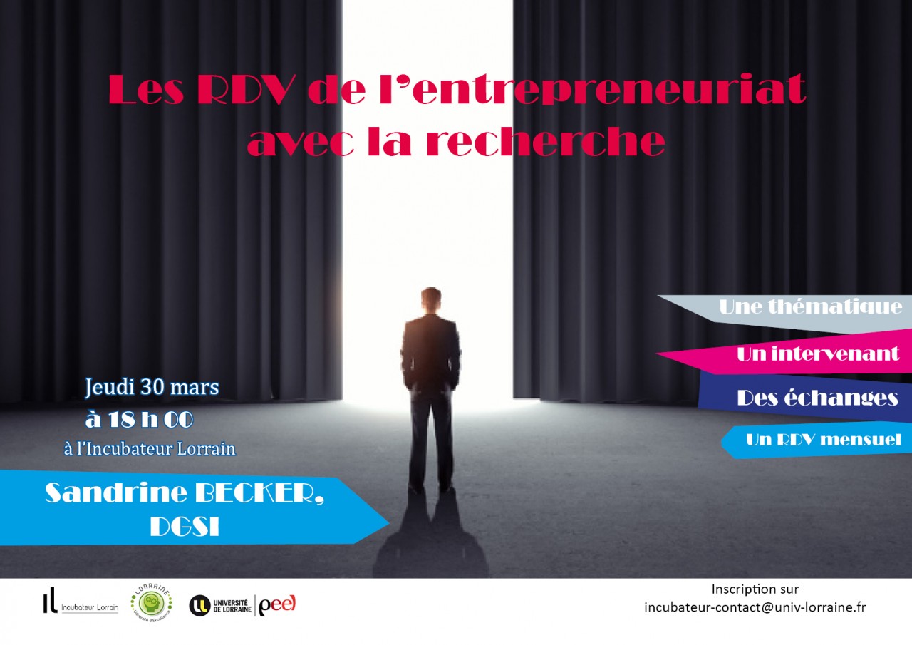 Le prochain RDV de l'entrepreneuriat avec la recherche, initiative commune de l'Il et du Peel, aura lieu le jeudi 30 mars à 18 h 00 en salle Daum (1er étage - site Brabois de l'Université de Lorraine, 2 avenue de la forêt de Haye à Vandoeuvre. Sandrine BECKER de la DGSI (Direction Générale de la Sécurité Intérieure) abordera le sujet suivant : "Comment se protéger plus efficacement contre les cybercriminels et assurer une meilleure protection des informations sensibles ?"