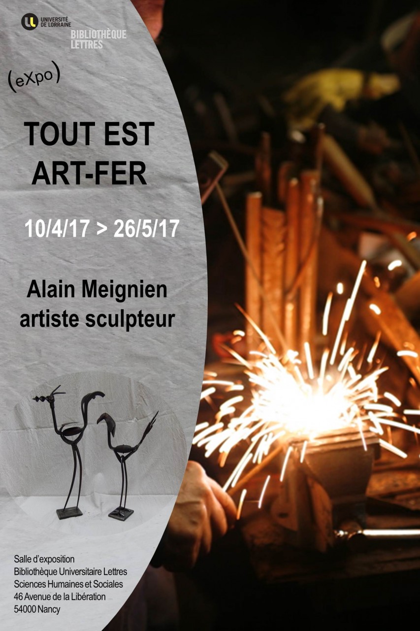Alain Meignien, artiste sculpteur propose une exposition de ses œuvres du 10 avril 2017 au 26 mai 2017 à la Bibliothèque universitaire de lettres. Alain MEIGNIEN fait des sculptures depuis bientôt 40 ans. Des statues en bois et acier, au début pour ne garder actuellement que l’acier déformé malmené forgé cisaillé et lui donner une allure un élan, une beauté autre. La base de ses sculptures, de vieux outils rouillés abimés portant encore des traces de terre ou de ciment, des outils qui ont vécu en quelque sorte. Aux murs d’une galerie toujours des arrosoirs ou des seaux à charbon écrasés surprennent le visiteur.