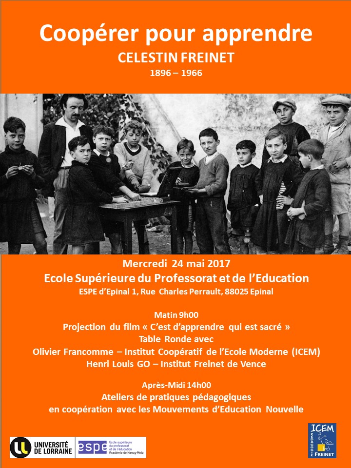 Dans le cadre des manifestations organisées pour le cinquantenaire de la disparition de Célestin Freinet, l’Ecole Supérieure du Professorat et de l' Education (ESPE) de Lorraine, Site d’Epinal co/organise avec le Mouvement de l’Ecole Moderne – Institut Coopératif de l’Ecole Moderne de Lorraine (ICEM – Pédagogie Freinet) une journée consacrée à Célestin Freinet.