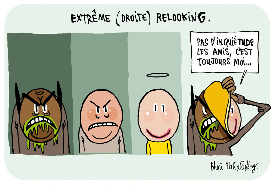Un an après, Rémi Malingrëy a porté un regard graphique et personnel sur mon article. Il montre très bien comment l'extrême droite autrichienne conserve son visage tout en se parant de masques séduisants faisant croire qu'elle s'est modifiée. Au vu de la situation actuelle de l'extrême droite en Europe – y compris en France –, ce dessin invite à la réflexion critique et à la mise en regard des extrêmes droites européennes. ![]()