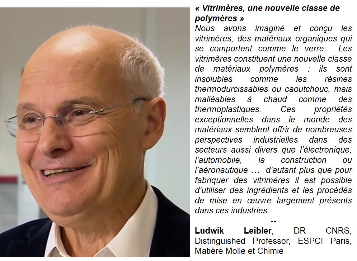 Nous avons imaginé et conçu les vitrimères, des matériaux organiques qui se comportent comme le verre. Les vitrimères constituent une nouvelle classe de matériaux polymères : ils sont insolubles comme les résines thermodurcissables ou caoutchouc, mais malléables à chaud comme des thermoplastiques. Ces propriétés exceptionnelles dans le monde des matériaux semblent offrir de nombreuses perspectives industrielles dans des secteurs aussi divers que l’électronique, l’automobile, la construction ou l’aéronautique … d’autant plus que pour fabriquer des vitrimères il est possible d’utiliser des ingrédients et les procédés de mise en œuvre largement présents dans ces industries.