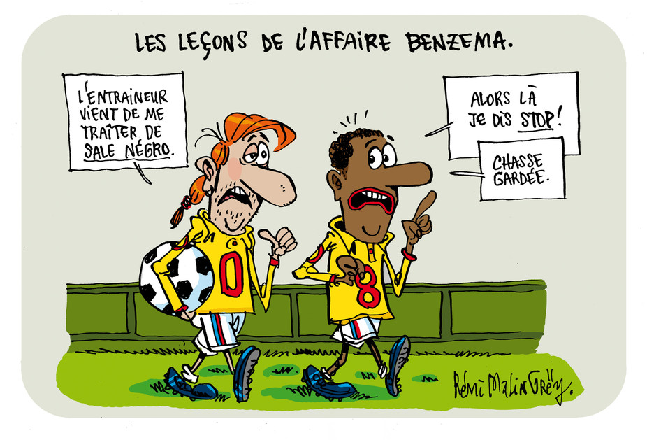 Un an après, l’« affaire Benzema » n’a pas disparu de l’actualité. Encore tout récemment (Le Figaro du 2 juin), l’ancien entraîneur Guy Roux a regretté la persistance de la non-sélection de Karim Benzema dans l’équipe de France pour les matchs du moment. Doit-on s’étonner de ce qui lui apparaît comme un « immense gâchis » ? Tant que la justice n’est pas passée et n’a pas lavé la star du Réal de Madrid de tout soupçon, il restera associé à une affaire sérieuse. Et la mise en cause du sélectionneur Didier Deschamps, soupçonné de céder à « une partie raciste de la France », est grave. Non seulement elle mobilise un argumentaire toxique et communautariste qu’illustre bien le dessin de Rémi Malingrëy, mais elle écarte l’idée de la prise en compte du comportement en dehors du terrain de foot. L’appartenance à l’élite conférerait une immunité de fait qu’il serait outrecuidant de ne pas respecter… Cette vision est fortement contestée par nos contemporains et l’année écoulée en a fourni de nouveaux exemples.